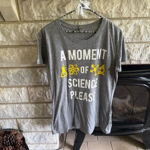 Gray t-shirt with a science-themed graphic in white and yellow. Great for the science lover or science teacher! This is a women’s cut shirt in a size large. Very stretchy material.
