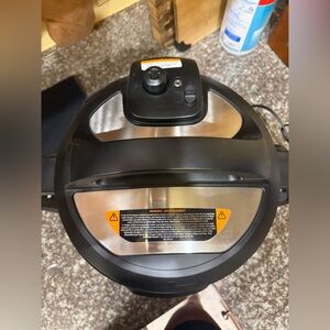 Stainless steel Instant Pot with multiple cooking functions. Features a digital display and easy-to-use controls.