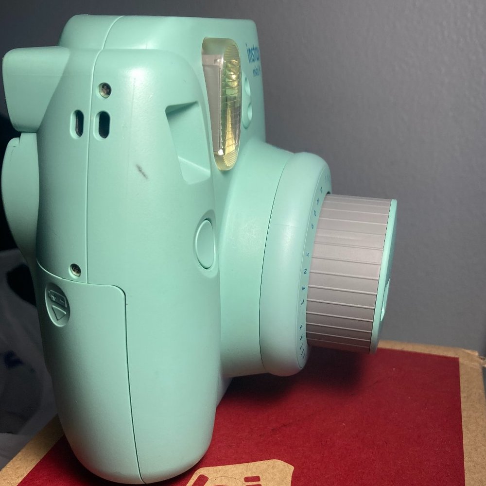 Light blue, good condition (small scruffs), instax mini camera