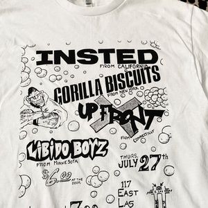 Insted Gorilla Biscuits Vintage Flyer T-Shirt. This was a flyer for a show that took place back in the day in Vegas. On the bill was Insted, Gorilla Biscuits, Up Front, and Libido Boyz. Hand screened on a White, 100% Cotton Tee