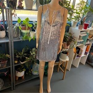 Shimmer in style with this stunning silver sequin slip dress. Perfect for a night out or special occasion.
