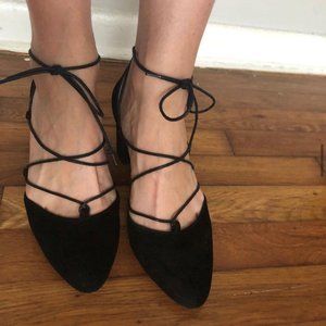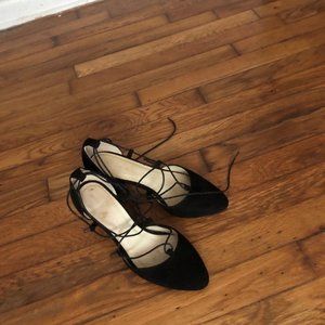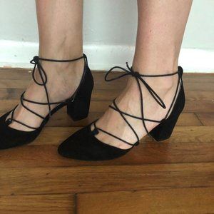 A pair of the sold-out Intentionally Blank Hatter Heels in Black Suede featuring a unique lace-up design. I wore these once and I love them but I don't have enough occasions to wear them to justify keeping. They are in excellent condition!