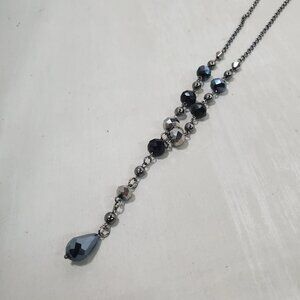 Inter American necklace is a sophisticated lariat or "Y" style piece, featuring a hematite-colored chain adorned with a mix of faceted black and smoky grey crystal beads, culminating in an elegant teardrop pendant.