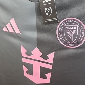 Stylish black and pink soccer jersey with logo details. Perfect for sports enthusiasts. Get this for the next game!!