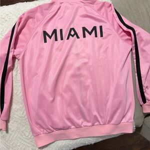 Stylish pink track jacket featuring a logo on the chest. Black accents on shoulders and zipper.