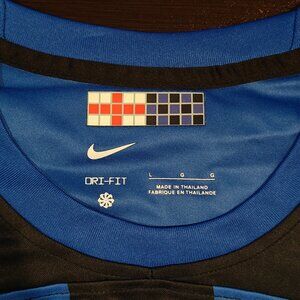 The product is the Inter Milan 2023/24 Home Jersey by Nike, designed specifically for men in size L. The jersey is in blue and black colors, with the team's logo and Nike branding prominently displayed. Made in Thailand, this jersey is for fans of Inter Milan who follow the Serie A tournament. Perfect for showing support for the team during matches, this jersey is a must-have for any dedicated soccer fan.
