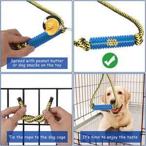 Interactive Dog toys: Spread peanut butter or your dog's favorite snack on the toy, then tie the string to the cage, and the dog can lick to get the food, to make getting the food more fun.