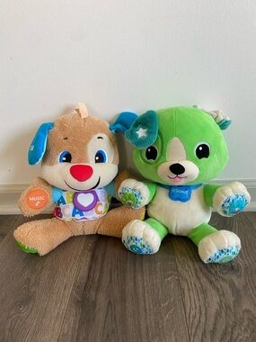 Interactive plush puppy in bright green with learning features. Encourages early learning with songs, sounds, and responsive buttons. Soft, cuddly design made for playtime and skill-building. Includes easy-to-press paw and collar controls. Great gift for young children who enjoy music and learning toys.