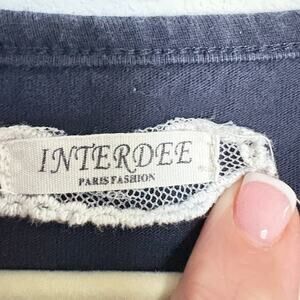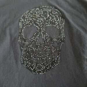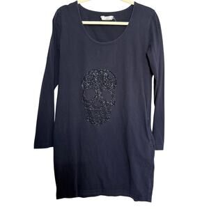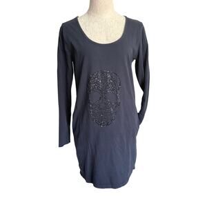 Blue long sleeve tunic tee or mini dress by Interrdee Paris. Features a large black rhinestone skull design on front. Scoop neckline and soft cotton blend. 100% cotton. Labeled M. Great for goth, glam rock, punk, or Halloween outfit base.