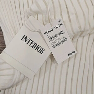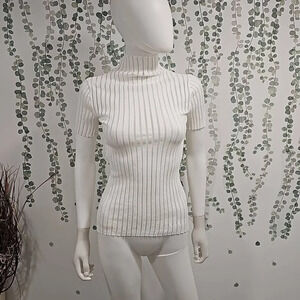 Dimensional plating creates a futuristic effect for this figure-skimming sweater made from soft cotton and nylon yarns.Tiny pinkish spot on the back. Please see picture