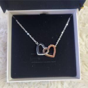 interlock double heart necklace. brand new in box. silver and other has a light gold tone. crystals diamond on outer ring of hearts. anniversary wedding daughter mothers day bridal gift christmas valentines day