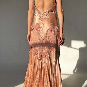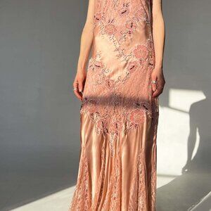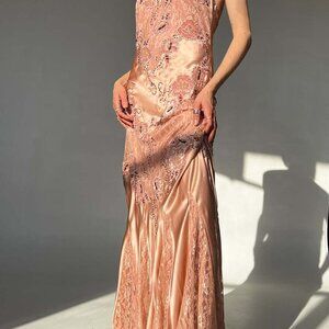 Gorgeous rose pink slinky maxi gown with lace and rose applique. Soft slinky fabric.