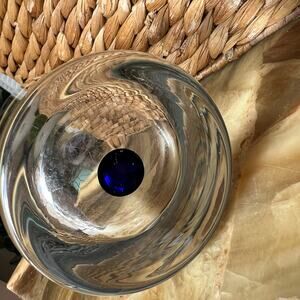 Intermezzo Blue Carafe by Orrefors, 12” tall. Intended for water or wine. Has maker stamp as bottom as pictured. Hand blown in Sweden with signature blue drop settled into the bottom. In great condition, no chips or cracks. Please refer to all photos for current condition and measurements.
