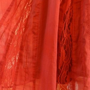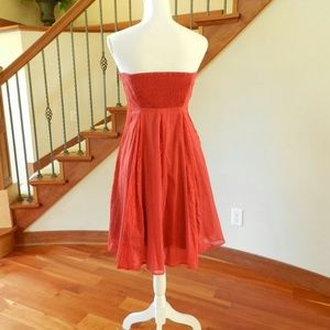 Intermissions dress from October 2007 catalog. Crimson cotton organdy is broken up by panels of matching lace. Smocked along the back. Lined. By Moulinete Soeurs. Sash or straps not included. Used condition, as is -- repair needed at the seam. orig $148. Size 2. 13.5"W.