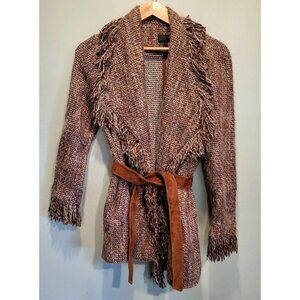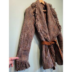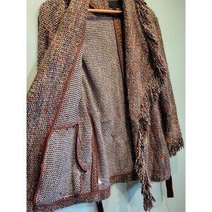 Intermix Brown Wool Blend Tweed Fringe Suede Belted Mid Length Wrap Jacket Sz S