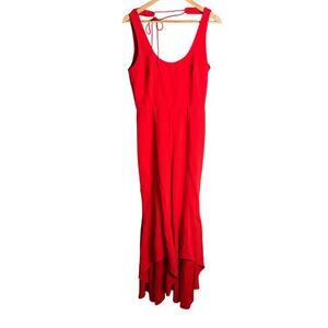 Intermix Gabrielle Ruffle Jumpsuit in Red. Size 4. Features scoop neck, sleeveless, back self-tie closure, flared leg, high-low hem, and hidden back zipper closure. 100% Polyester. Stitch unraveling as shown in last photo.