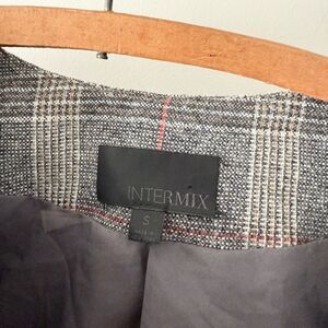 This Kiara plaid blazer from INTERMIX in grey, tan, white, and red features ruching and ruffle detailing at the long sleeves, a round neckline, a covered button front, and full lining. 40% wool, 30% cotton, 15% nyon, 10% poly, 5% other fibers