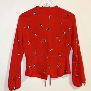 100% silk long sleeve red top with black and white floral design, with three ties in the front that can be tied as loose or as tight as you want. Slight flare at waist.