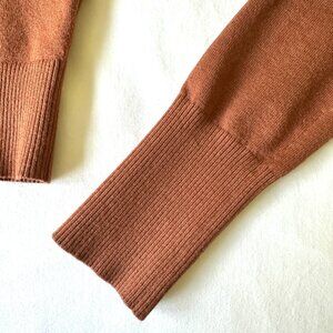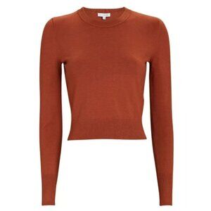 Intermix cropped Renee sweater in rust brown with rib knit neck, cuffs and hem. A lightweight, cozy layer for transitional weather with a timeless crewneck silhouette. This is a petite size 2, has a skinny fit, and would also fit a regular US size 2-4. See photos for measurements.