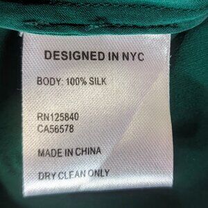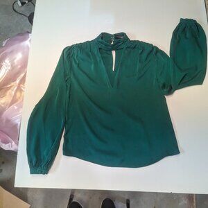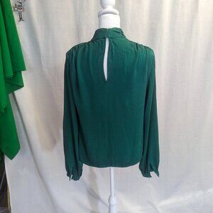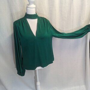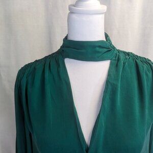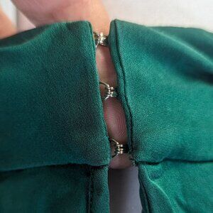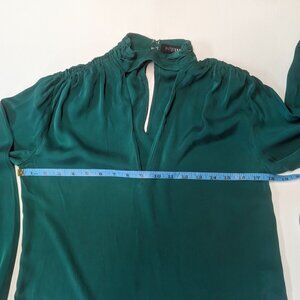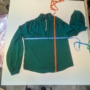 Where to start? Beautiful keyhole (actually a pretty deep "v") choker neck, ruched on the shoulders, and deep back keyhole secured by 3 hook and eye closures. 100% soft, cool, beautiful silk, in a solid dark green, and in excellent condition. You will be breaking necks in this!