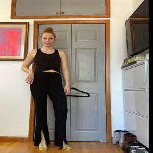Intermix Stretch Knit Flare Ribbed Trousers with Front Slit