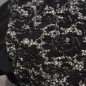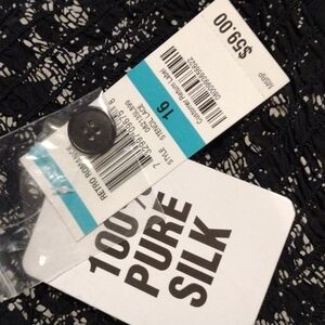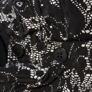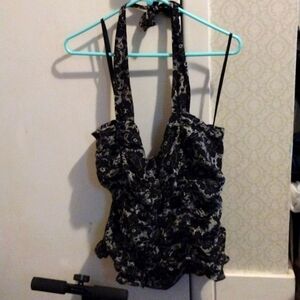 Black with lace print 100% Silk halter top from INC International Concepts. Buttons down the front, deco only. Gathered stretchy back. New with Tags Size 16.