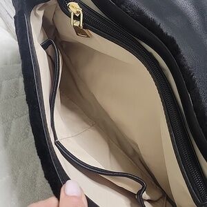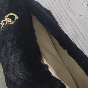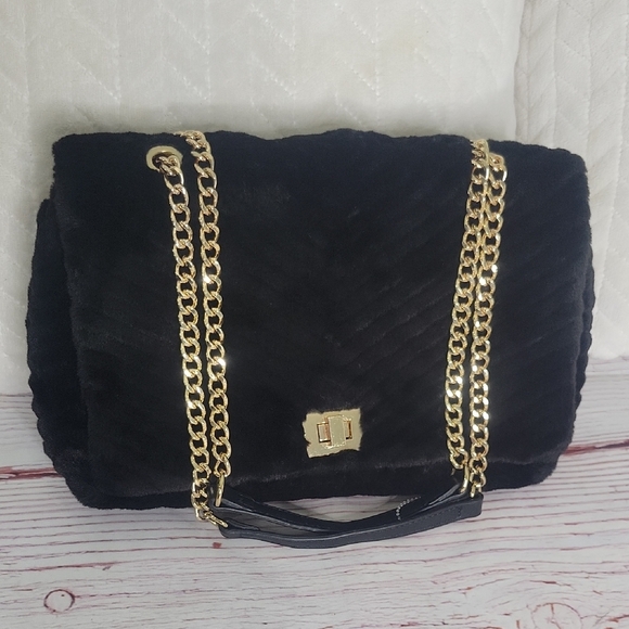 Inc International Concepts black faux fur with gold chain strap. Strap can be worn as a shoulder bag or longer.