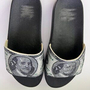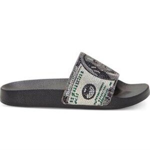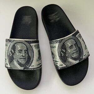 International Concepts Peymin25 Money Benjamin Franklin $100 bill rhinestone crystal pool slides. Size 8. Excellent pre-owned condition. I removed the "INC" on the heel of the slide by using acetone to remove the logo. See photos.