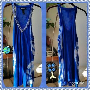 Stunning, boho-chic is this tie dye electric blue/white, racer-back w/ V-neckline silver embellishments. Versatile can be worn as a tee w/ leggings, skinny jeans, bralette or dress w tights or not, sandals, boots, sneakers whatever you're comfortable to rock it w/. Loose fitting 19.5" width, 29" length. 100% rayon, wash cold inside out.