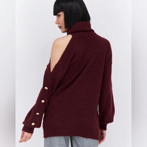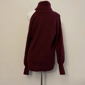 Size medium burgundy one cold shoulder metallic specks sweater. There is a snag on the turtleneck area. Shown in the last photo.