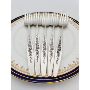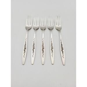 The International Deep Silver LAUREL MIST Dinner Forks Set includes 5 silverplate dinner forks featuring a floral handle pattern in a silver plated material. This set is ideal for Thanksgiving dinners or special occasions and is part of the International Deep Silver brand known for its quality silverware. The elegant design with a touch of flowers makes these dinner forks a stylish addition to any adult's flatware collection.