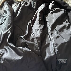 Black coat with animal print lining at the collar, cuff, and the front. Button closure and 2 front pockets. In great used condition, no flaws or damage to note.