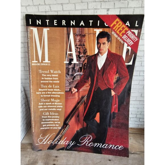 Vintage International Male Magazine Catalog S2 featuring late 1990s mens fashion editorials and product spreads. Holiday Romance cover with iconic International Male styling, tux and eveningwear inspiration, and glossy full-page photography. Includes Editor’s Choice pages, catalog ordering sections, and complete interior content.