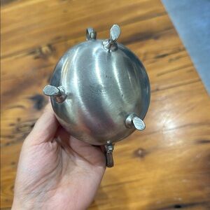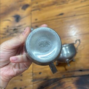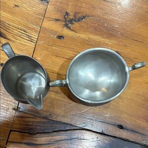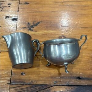This exquisite pewter serveware set includes a beautifully crafted sugar bowl and matching creamer, perfect for elevating your dining experience. The pieces feature a classic design with a matte, aged patina, adding a touch of vintage charm to any table setting. Ideal for formal dining occasions, this set is a timeless addition to your serveware collection. Preowned.