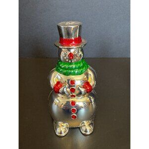 Some minor surface scratches on the metallic finish, consistent with vintage condition. Each snowman shaker: top to bottom = 4.5 inches.