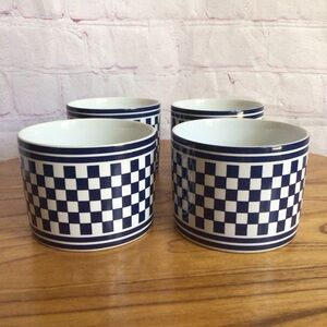 Elevate your dining experience with this set of International Tableworks mugs, featuring a classic blue and white checkered design. Ideal for serving soups or hot beverages, these mugs offer both style and functionality. Their timeless appeal makes them a perfect addition to any dining setting. Oven and dishwasher safe. Each mug measures approximately 2 1/2” tall, 4 1/2” wide including the handle. Great vintage condition. No chips, cracks or repairs. Two of the mugs have marks / scuffs inside from use. Smoke free home.