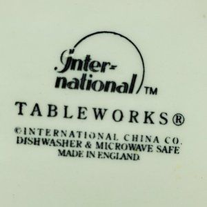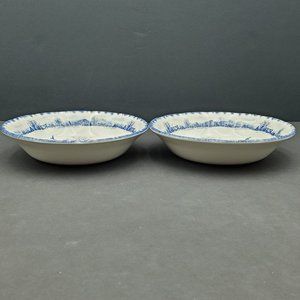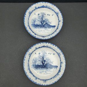 International Tableworks Riverwood Soup, Cereal Bowls - Set of 2. Off-white bowls with a blue rural landscape design on the bottom and rim. Excellent pre-owned condition with very slight crazing on the inside bottoms. 6.75" x 1.5".