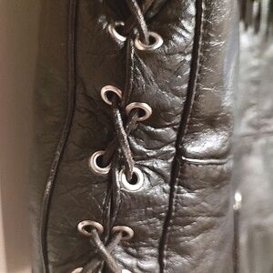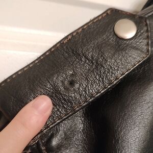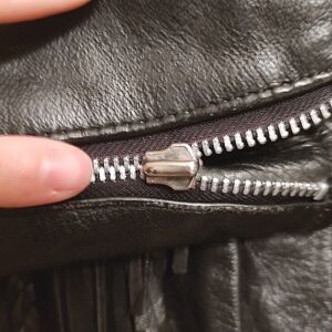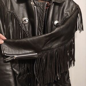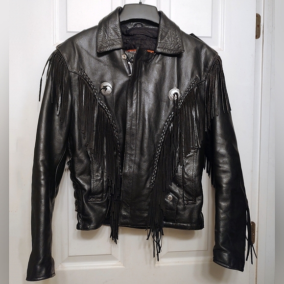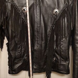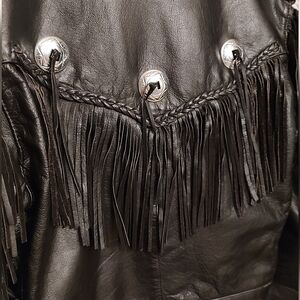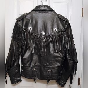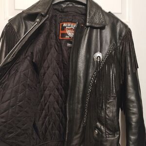 Womens genuine leather riding jacket. Western fringe heavy duty jacket with a removable insulated liner. Previously owned in good condition. Small hole from pin on shoulder and missing zipper handle (pictured).