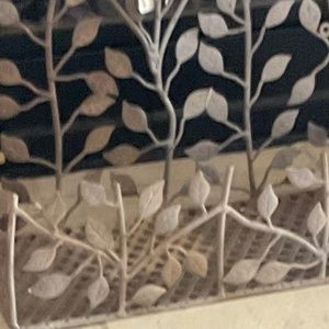 Tan colored metal shelf with leaves interwoven that can hold plants, towels, bath items, and more. Can be used in kitchen for spices, oils and more. Great for indoor and outdoor on patio). New from our on line store we had to close. In very good condition. Nothing bent. Very strong. 15” high in back, 5 1/4” high in front and sides, 15.5” wide,