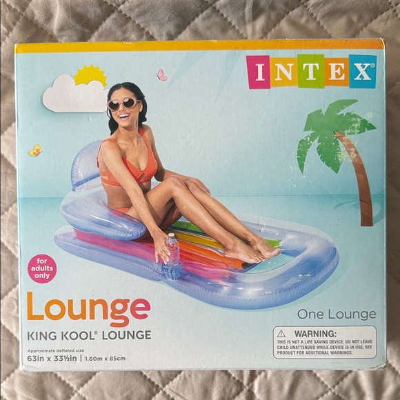 Intex King Kool Lounge inflatable pool float in multicolor. Durable vinyl construction with built-in backrest for comfortable lounging. Bright rainbow striping adds a fun, vibrant look to your pool or beach time. Easy to inflate and store when not in use.