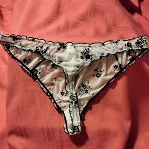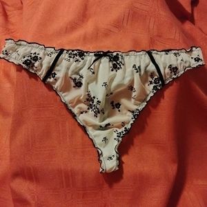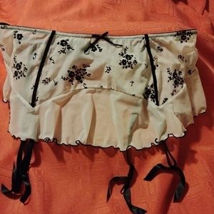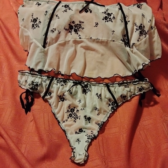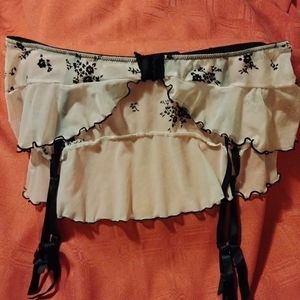 vintage set a beautiful Garters with matching Thong panty it's cream and black and the front of the Garters is free flowing almost like a skirt it's not letting me add the size is XL