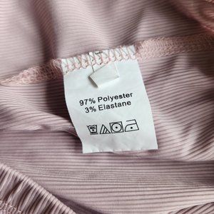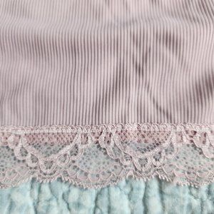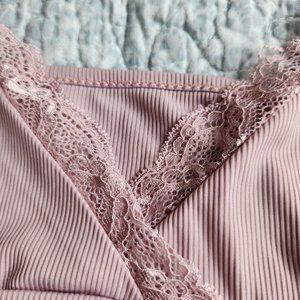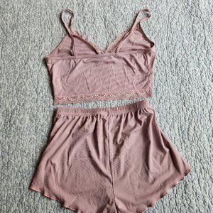 Pretty and feminine dusty pink ribbed crop top trimmed in lace with matching high waisted shorts