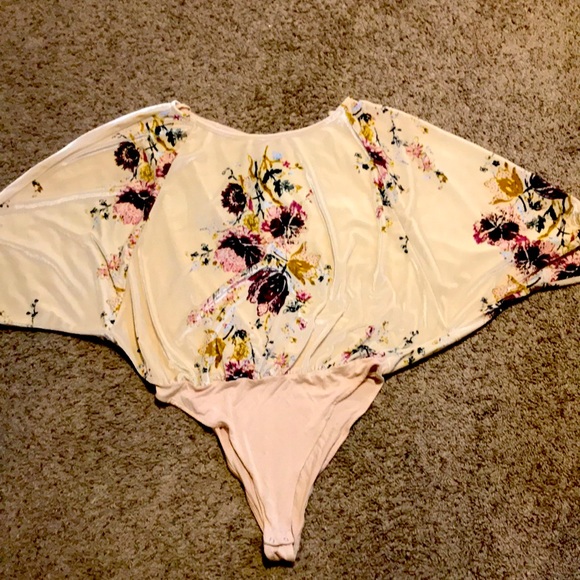 Intimately free people. Velvet floral Bodysuit. Size Medium. I’ve never worn this,it was to baggie in the crotch. The top blouse is over .I have longer legs and a short torso, so this didn’t work for me. Very pretty details in this bodysuit!