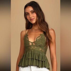 Keywords: Free People cami, Adella tank, boho lace crop top, festival outfit, olive green top, summer blouse, bohemian style, Y2K top, romantic lace tank, Free People Intimately, trendy women’s tops