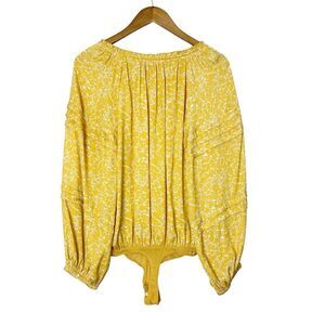 Yellow floral, balloon sleeves, tie at neckline. Liner attached.