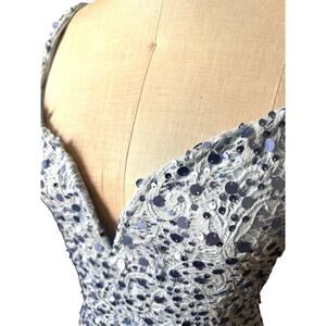 Textured fabrication with embroidery, sequin detail allover, square neckline with V-shaped wire at bust, fixed shoulder straps, high-cut legs, lined, low back