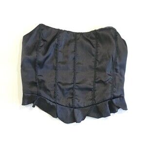 The product is an Intimately Free People black satin siren tube top corset with a sweetheart neckline and ruffle accents. This slim-fit corset features a pullover closure and is designed for parties or cocktail events. It is made of satin material and has a solid black color with a silver theme. Recommended for hand wash only, this corset is perfect for summer, fall, and spring seasons, offering a lightweight and stretchy feel for a comfortable and flattering fit.