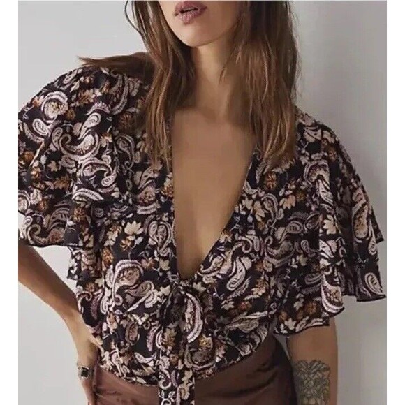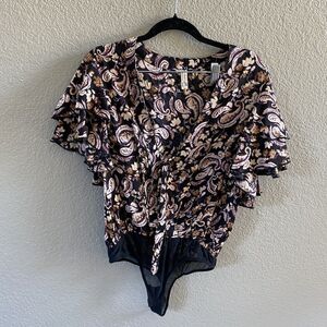 Intimately Free People Bodysuit Womens Small Black Call Me Later Ruffle Floral