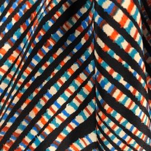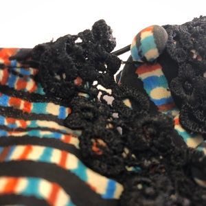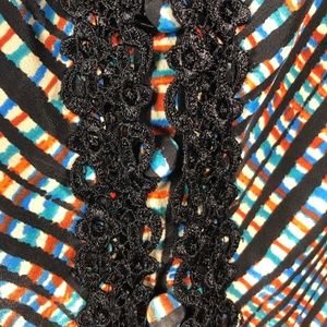Color: Black stripes over blue, teal, red and orange stripes. Black crochet.