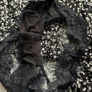 Black and white floral with layered ruffled bell sleeves, v neck, snaps at gusset